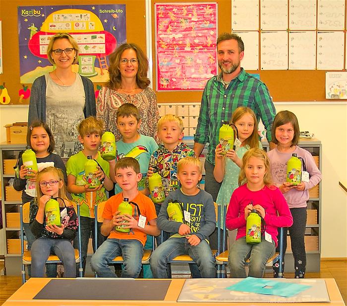 Mit dabei Emil die Flasche, welche an jedes der Kinder verschenkt wurde. Für die Kinder ist es der erste Zugang zur Abfallvermeidung. Dadurch können sie ihr Getränk in einer Mehrwegflasche in die Schule oder am Sportplatz mitnehmen.