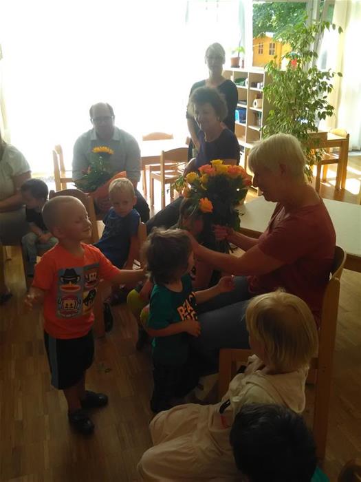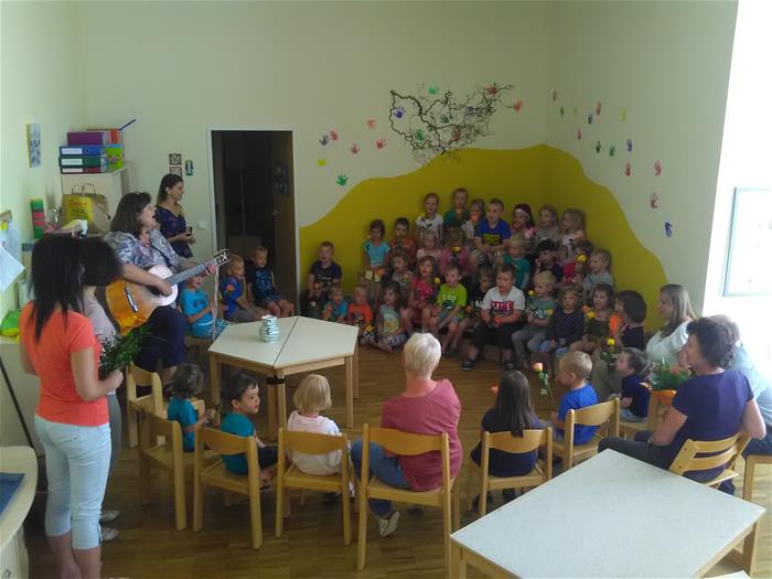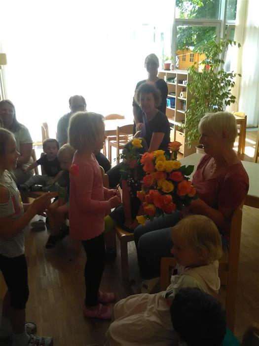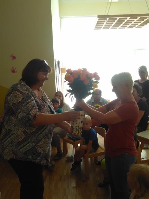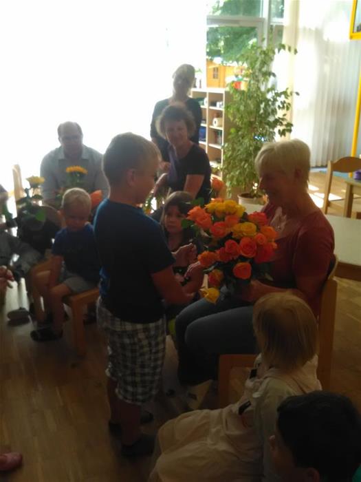 Vom Kindergartenteam erhielt Frau Stohl als Abschiedsgeschenk eine wunderschöne Vase, auf welcher sich jedes Kind mit einem Fingerabdruck verewigen durfte. Weiters überreichten die Kinder Rosen mit Wünschen für die Zukunft, welche in der neuen Vase Platz fanden.