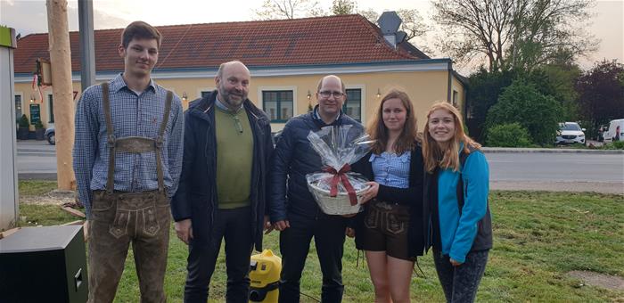 Unter der Mithilfe der FF Guntersdorf wurde der Maibaum aufgestellt. Michael Neumayer, Leiter der Landjugend, begrüßte die zahlreichen Gäste und bedankte sich bei unserem Bürgermeister Ing. Mag. Roland Weber und Vizebürgermeister Ernst Binder für die großzügige Finanzierung des Jugendheimes. Rohringer Anna und Petz Martina überreichten einen Geschenkkorb.
