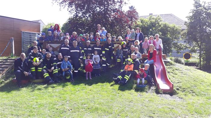 Im Anschluss an die Übung besuchten die Kameraden der beiden Wehren noch die Kindergartenkinder, um ihnen nochmals zu zeigen, wer in den Uniformen steckt.