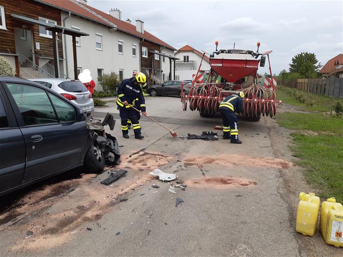 Ein Traktor und ein PKW waren im Zuge eines Auspark - Manövers kollidiert, das Auto dadurch im vorderen Bereich vollkommen zerstört. Rasch wurde die Unfallstelle abgesichert und die austretenden Betriebsmittel gebunden. Das demolierte Fahrzeug wurde von der Firma Machalek abtransportiert und im Anschluss die Straße gereinigt.