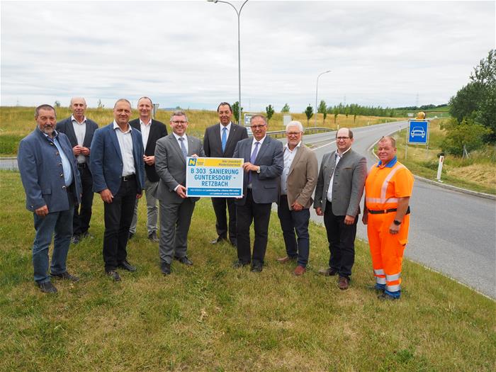 Landesrat Ludwig Schleritzko überzeugt sich am 9. Juli 2021 in Vertretung von Landeshauptfrau Johanna Mikl-Leitner vom Stand der Bauarbeiten für die Fahrbahnsanierung an der Landesstraßen B 303 zwischen Guntersdorf und Retzbach in den Gemeindegebieten von Guntersdorf, Pernersdorf, Haugsdorf und Retzbach.