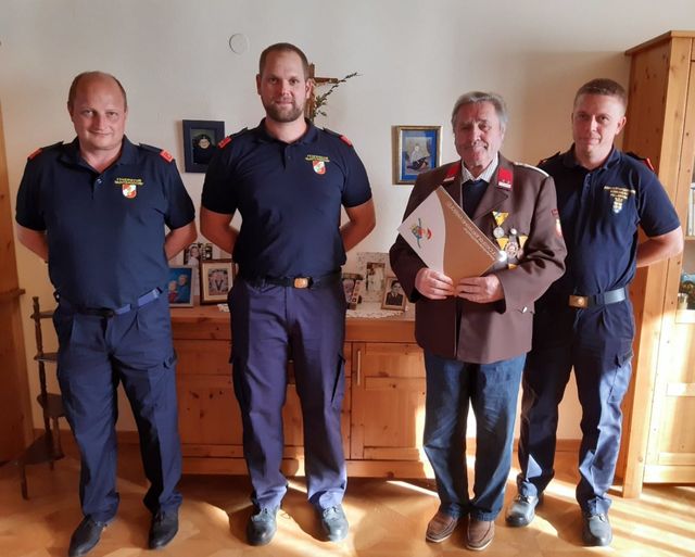 Deshalb besuchte ihn unser Kommando im Beisein von Abschnittsfeuerwehrkommandant Markus Zahlbrecht zu Hause. Alois Pfeifer erhielt das Ehrenzeichen für langjährige verdienstvolle Tätigkeit im Feuerwehr- und Rettungswesen. Er ist seit mittlerweile 60 Jahren Mitglied bei der Freiwilligen Feuerwehr Guntersdorf.