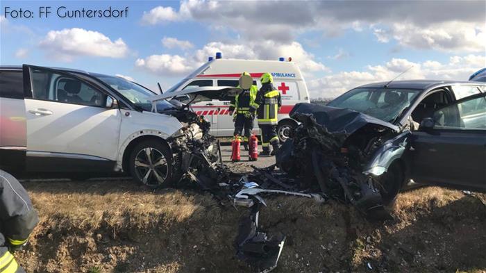 Auch zu Mittag am 12. Februar heulten in Guntersdorf die Sirenen. T1 - Verkehrsunfall mit 6 verletzten Personen lautete der Alarmierungstext. Binnen weniger Minuten rückten die Kameraden zur Einsatzstelle auf der B303 Richtung Jetzelsdorf aus, wo sich dem Einsatzleiter folgendes Bild bot: Zwei PKW waren frontal zusammengestoßen, mehrere Verletzte befanden sich in der unmittelbaren Umgebung, darunter auch Kinder. Das Rote Kreuz war bereits mit einem Fahrzeug bereits vor Ort, ebenso die Polizei. Umgehend wurde die Unfallstelle mit doppeltem Brandschutz gesichert und mit der Betreuung der Fahrzeuginsassen begonnen. Nach und nach trafen weitere Kräfte des Roten Kreuzes ein, welche von den Feuerwehrkameraden bei der Versorgung unterstützt wurden. Im weiteren Verlauf trafen auch zwei Notarzthubschrauber ein, welche die schwer verletzten Personen abtransportierten. Nachdem alle Beteiligten abtransportiert wurden, begannen die Kameraden mit der Reinigung der Fahrbahn und dem Einsammeln der herumliegenden Fahrzeugteile. Als auch die Unfallfahrzeuge durch die Firma Machalek verladen waren konnten noch ausgelaufene Betriebsmittel gebunden werden. Nach knapp zwei Stunden konnte die Einsatzbereitschaft wieder hergestellt werden.