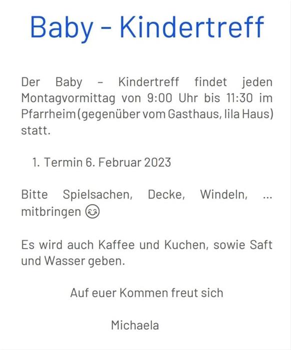 Jeden Montag Vormittag findet eine Baby Spieletreffen statt.