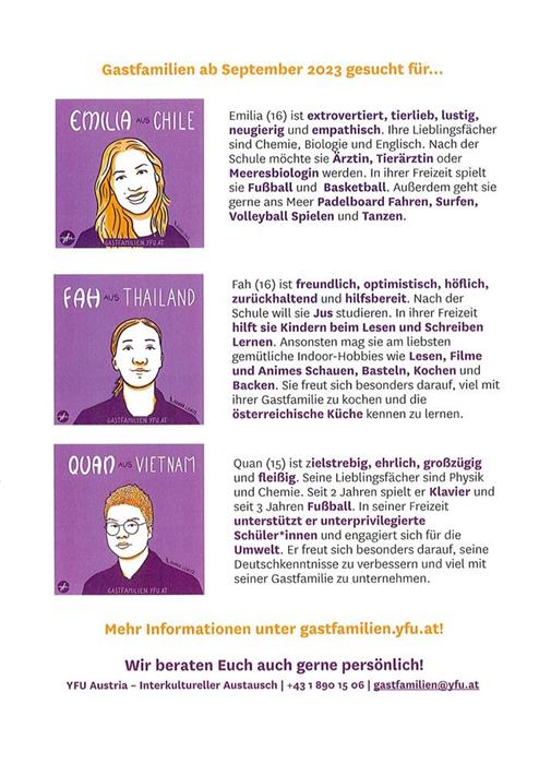 Ein Infoblatt und illustrierte Bilder zu den drei genannten Schüler*innen schicke ich Ihnen anbei mit, diese können gerne geteilt werden. Kurzprofile aller Schüler*innen und weiterführende Infos zum Gastfamilienprogramm sind unter https://gastfamilien.yfu.at zu finden. Anbei schicke ich auch nochmals unseren Brief zur Gastfamiliensuche mit, den Sie z.B. gemeinsam mit den Infos zu den Schüler*innen teilen können!