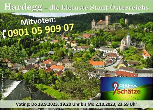 Wir bitten Euch um Eure Unterstützung! Bitte stimmt beim ORF-Voting für Hardegg und leitet dieses Email an viele Freunde und Bekannte weiter! Unser Ziel ist es, dass jeder, der die kleinste Stadt Österreichs kennt und schätzt, bei der Abstimmung zu "9 Plätze - 9 Schätze" mitmacht und für Hardegg stimmt.