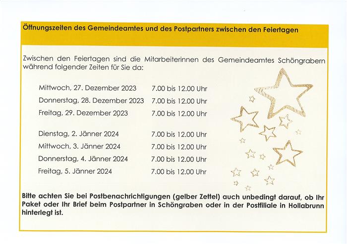 Öffnungszeiten während der Feiertage - des Postpartners in Schöngrabern - Gemeindeamt Schöngrabern