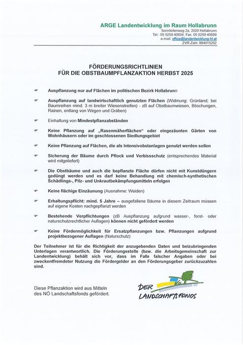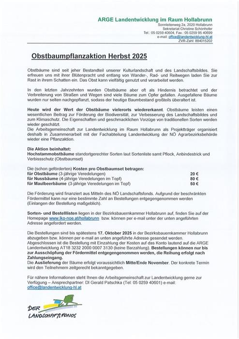 Auch heuer gibt es wieder die Möglichkeit, im Rahmen der Pflanzaktion der Arbeitsgemeinschaft zur Landentwicklung im Raum Hollabrunn in Zusammenarbeit mit der NÖ Agrarbezirksbehörde kostengünstig Hochstammobstbäume zu erwerben.
